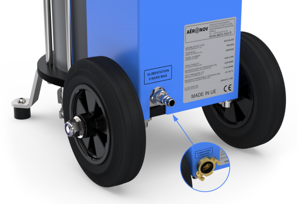 L'alimentation en air comprimé de l'aérogommeuse Eco-Blastse fait très simplement grâce au coupleur de type européen (par défaut) ou raccord express (à spécifier lors de la commande).